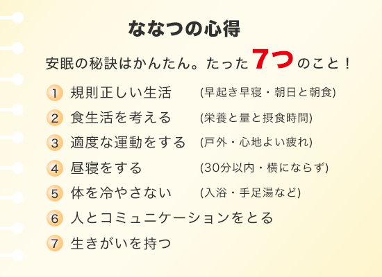 安眠・快眠のためには、まず、たった七つのことを実行できるかが最初のステップです。